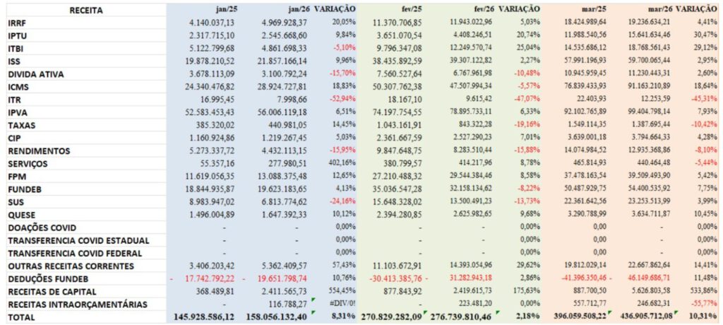 A arrecadação nominal acumulada de janeiro a março deste 2026 teve bom resultado total, com R$ 40 milhões a mais do que o mesmo período de 2025. Contudo, o olhar nas entrelinhas dos dados oficiais divulgados pela Secretaria Municipal da Fazenda identificam o já indicado cenário preocupante com o fechamento das contas neste exercício e o aperto ainda maior projetado para 2027.