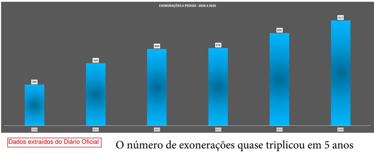 O dado mais sensível do levantamento reside no crescimento expressivo das exonerações ao longo do período analisado, atingindo em 2025 um patamar quase três vezes superior ao observado em 2020, o que reforça a existência de uma tendência estrutural de evasão, que não pode ser tratada como fenômeno isolado.