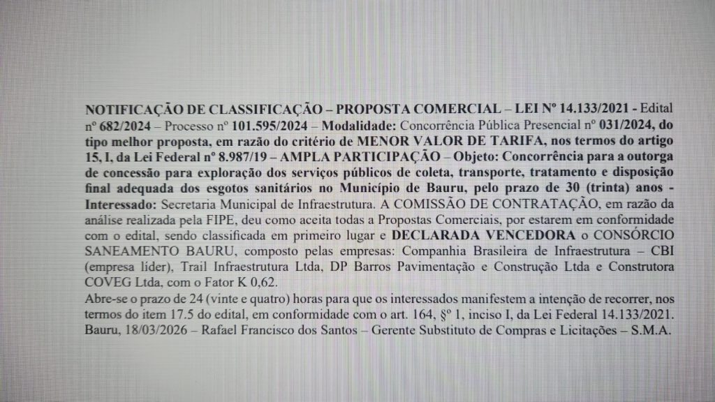 O Município acaba de publicar no Diário Oficial o consórcio Saneamento Bauru como vencedor do edital de concessão do esgoto e drenagem da av Nações Unidas, orçado em R$ 3,6 bilhões.