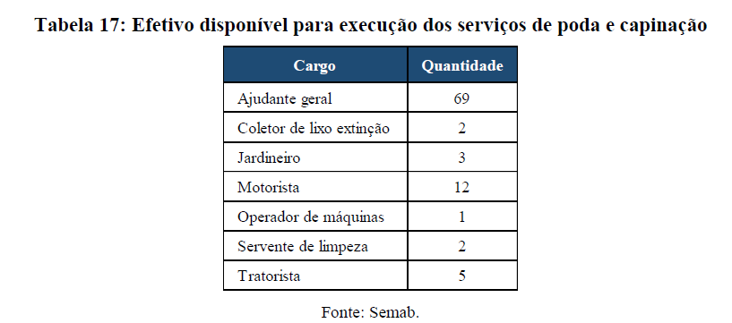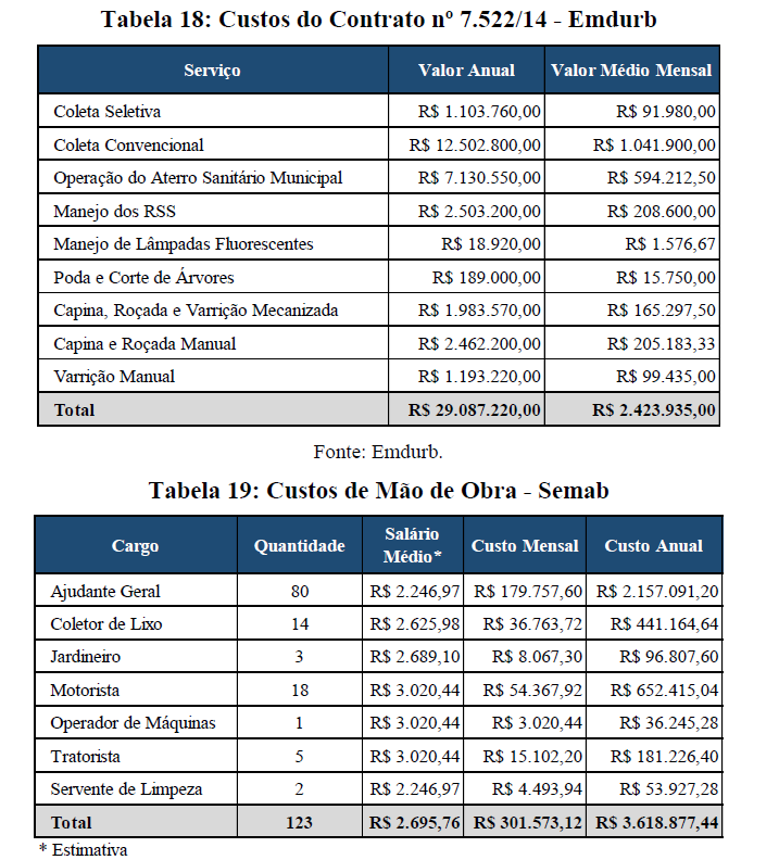 Pela mesma razão, o estudo dificulta projetar (e avaliar) o rateio para despesas em serviços de limpeza pública. É preciso ressaltar que essas despesas continuam a sair do caixa do Município pelo projeto. A capinação, por exemplo, traz que em 2015 foram executados 68.465 m2 do serviço mecanizado por mês e 147.335 m2 executados na forma manual. Em 2013, o Município teria desobstruído apenas 3.386 bocas de lobo. Os contratos com resíduos e limpeza pública teriam totalizado R$ 32,8 milhões na ocasião.