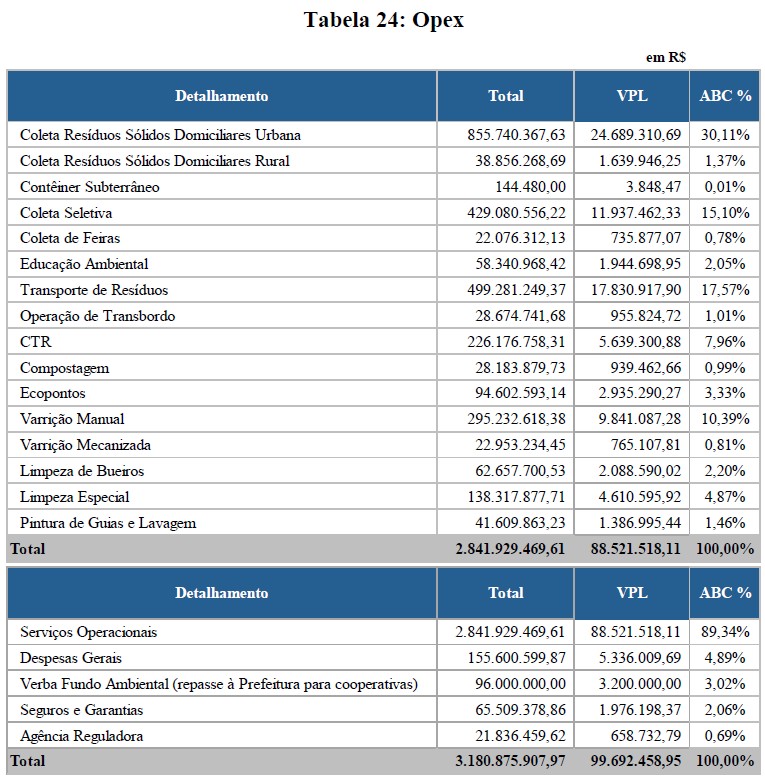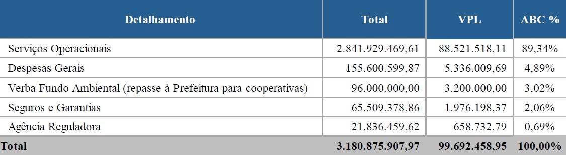 A modelagem jurídica, econômica e operacional da PPP submetida a segredo pela secretária do Meio Ambiente, Cilene Bordezan, trata do contrato de maior valor de toda a história da cidade. O caderno dos dados econômicos, com 115 páginas, assinado pelo coordenador do projeto pela Fipe, Denisard Cneio Alves (que também assina o estudo da concessão do lixo e drenagem de Bauru) descreve que o custo total para operar todos os serviços de lixo (coleta, transporte, separação e tratamento final em usina) está projetado em R$ 3,180 bilhões. Os investimentos exigidos com frota de caminhões, máquinas leves e pesadas, conteiners, 6 novos Ecopontos e readequações físicas são de R$ 622 milhões.